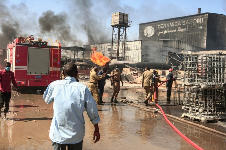 A burning gas tank at the scene of a fire at a tile manufacturing unit in an industrial zone in sudan's north Khartoum. December 3, 2019 / AFP / Ebrahim HAMID