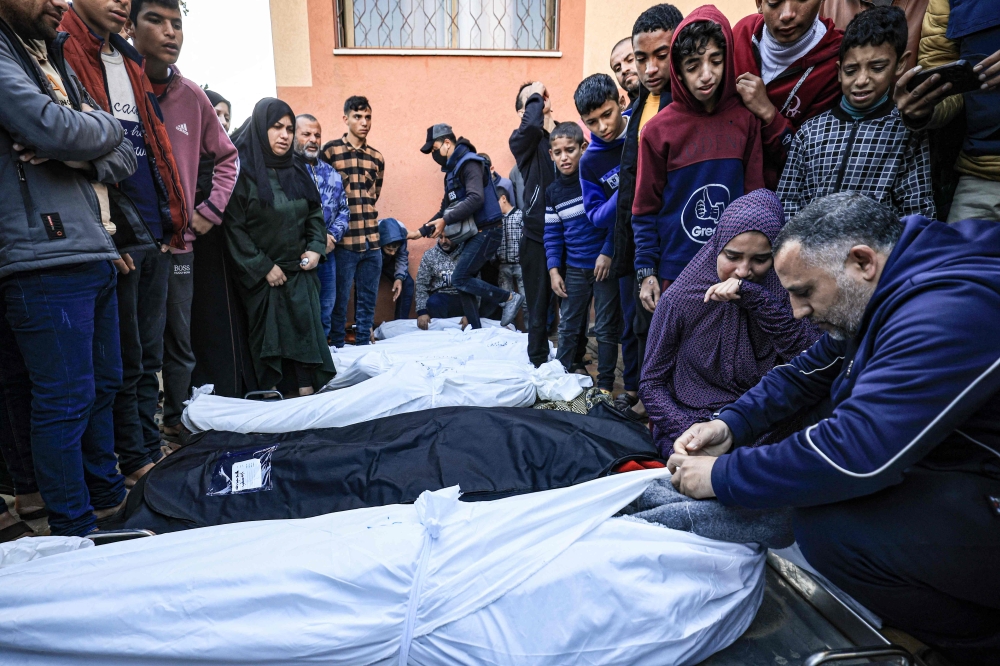 Relatives mourn over the bodies of the Salah and Abu Hatab families, killed when the tent where they were sheltering was hit by Israeli bombardment, at the morgue of the Nasser medical centre in Khan Yunis in the southern Gaza Strip, on January 4, 2024. Photos by AFP