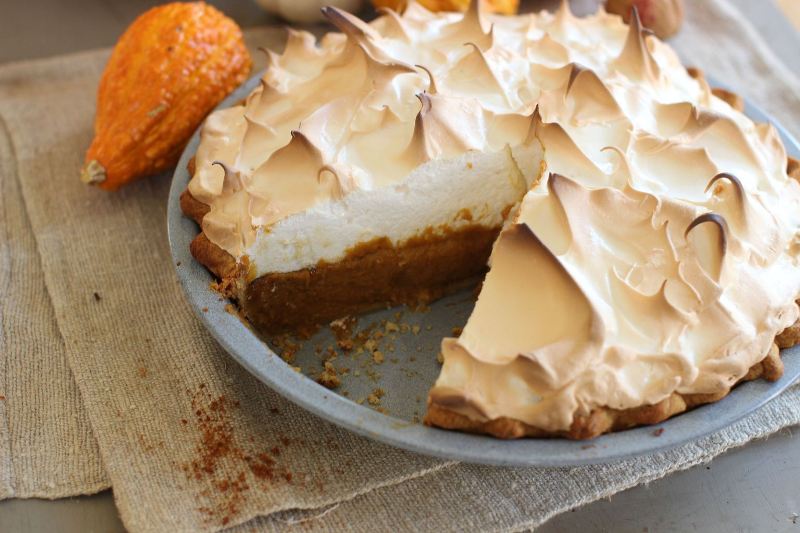 This Thanksgiving pie is deliciously deceptive. Until you cut into it, it looks like your classic lemon meringue pie, piled high with billows of whipped and toasted egg whites. But once the knife slices through that sweet topping, the real deal is revealed. Hidden under the meringue is a classic pumpkin pie spiked with just a hint of citrus.