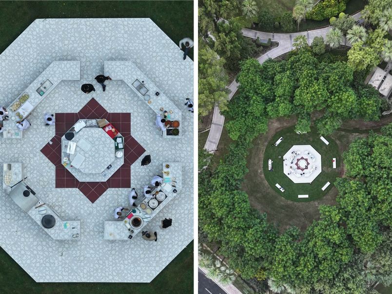 Tiravanija's untitled 2025 (no bread no ashes) transforms a corner of MIA Park into a living installation where art, food, and social connection converge. The design of the octagonal pavilion is inspired by local heritage and Islamic geometry and invites visitors to gather and share freshly baked bread.