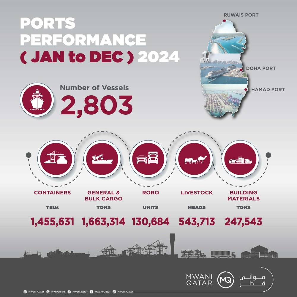 Hamad, Doha and Al Ruwais ports handled 1,455,631 TEUs (twenty-foot equivalent units) containers, received 1,663,314 tonnes of general and bulk cargo shipments, 130,684 RORO units of vehicles, 543,713 heads of livestock and 247,543 tonnes of building materials from January to December 2024.