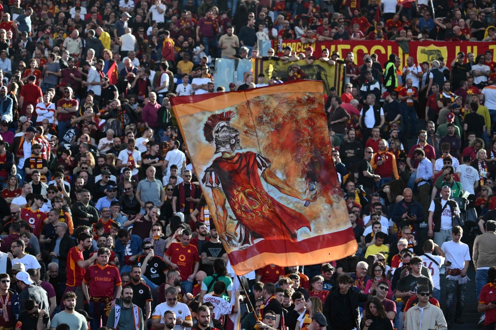Roma's supporters wave flags before the Italian Serie A football match between AS Roma and Lazio on April 6, 2024 at the Olympic stadium in Rome. (Photo by Alberto PIZZOLI / AFP)