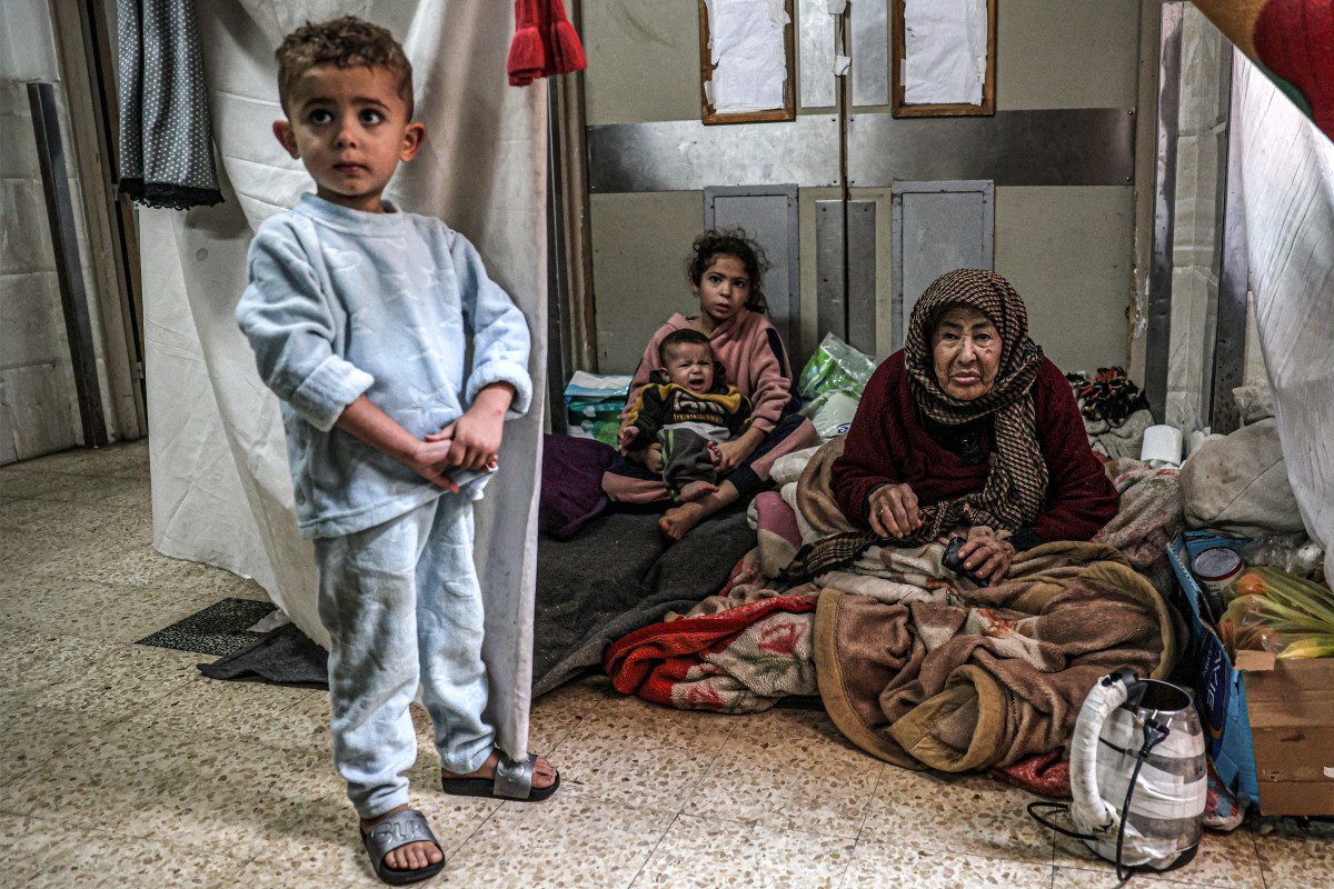 An elderly woman looks on as she sits with children at a makeshift camp in an area of the European Hospital in Khan Yunis in the southern Gaza Strip on December 31, 2023. Photo by AFP