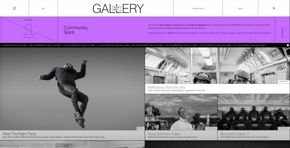 Shaaban further explains, “We aimed for a casual, inviting feel that inspires conversations. Hence the website was designed to look more like a blog with a number of different stories or parallel tabs that fit under an issue’s specific theme, than a corporate landing page. A regular visitor to the site will notice how the storylines on the main page change over the span of an issue – usually two months – as we update additional parallels to it. The viewer gets to see a narrative that starts with an exhibition opening, but then extends far beyond that in terms of offering complementary information to the visitor. This helps the viewer gain a wider understanding of an exhibition or event in relation to the theme.”