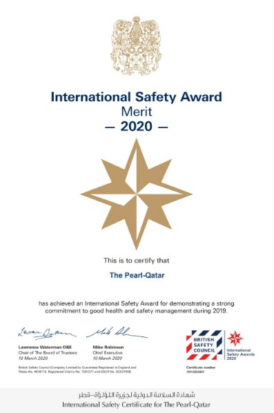 United Development Company (UDC), a leading Qatari public shareholding company and master developer of The PearlQatar and Gewan Island, has received the International Safety Award 2020 in Merit category by the British Safety Council in recognition of its commitment to keeping its community at The Pearl-Qatar including workers and workplaces, healthy and safe.