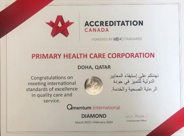 An online virtual ceremony was attended by Minister of Public Health H E Dr. Hanan Al Kuwari and Dr. Mariam Abdul Malik, Managing Director of PHCC with senior leadership from both PHCC and Accreditation Canada team.