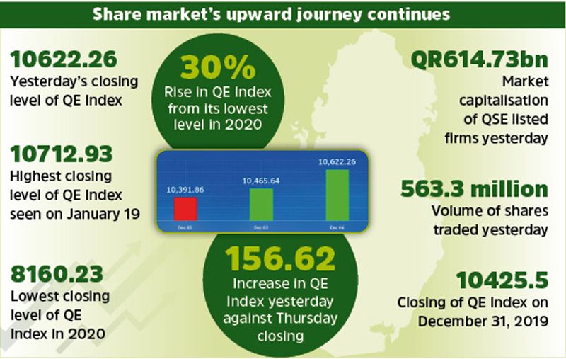Qatari shares reached a new milestone yesterday as the Qatar Stock Exchange (QE) Index surged 156.62 points to close at 10,622.26 points, which is 10-month high for the index. The consistent rally in the stock market has cemented hopes among investor that the QE Index may see new highs before the end of this year. The index has risen over 230 points in the last two trading sessions.