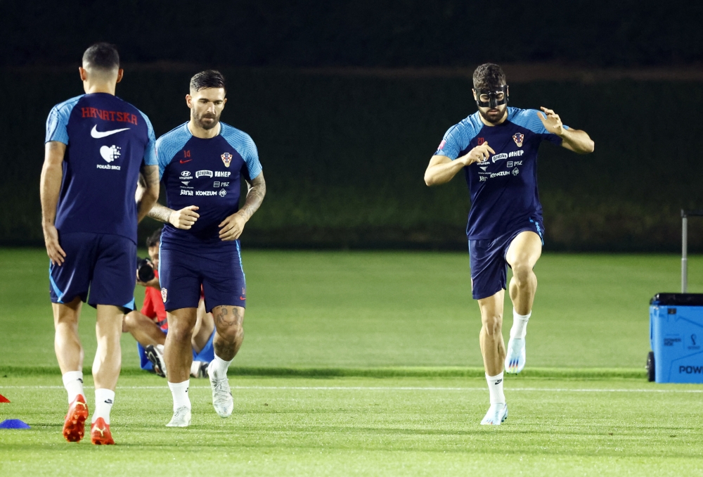 Croatia's Marko Livaja and Josko Gvardiol during a FIFA World Cup Qatar 2022 training at the Al Erssal Training Site 3, Doha, Qatar, on December 7, 2022. REUTERS/Suhaib Salem