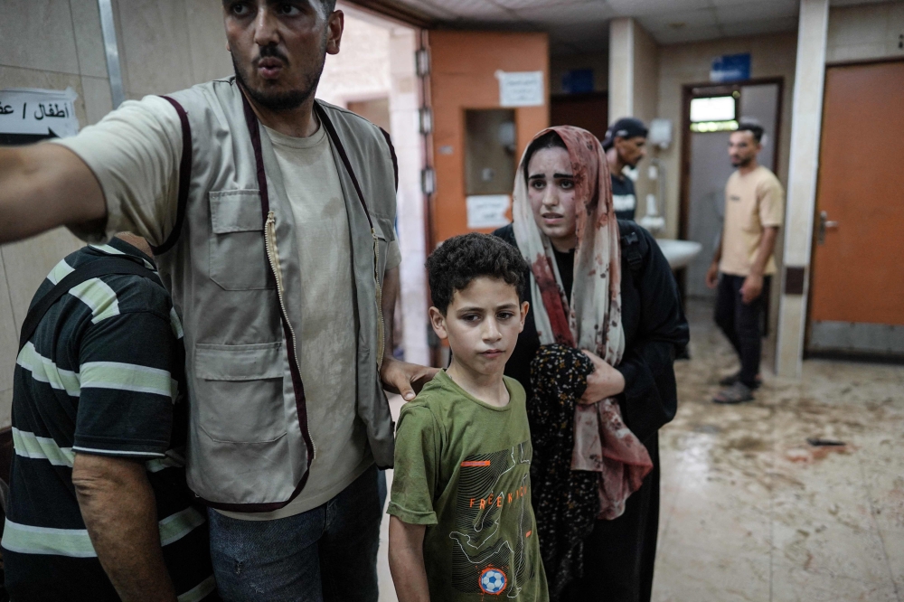 A woman and child arrive at the al-Aqsa Martyrs Hospital in Deir al-Balah, in the central Gaza Strip, following the Israeli bombardment of a residential apartment in Deir al-Balah and an area of al-Maghazi, on June 8, 2024. Photo by Bashar TALEB / AFP.