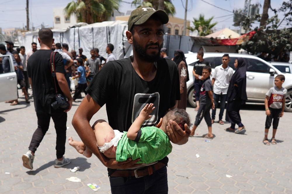 A man rushes with an injured infant following the Israeli bombardment of a residential apartment in Deir al-Balah and of an area of al-Maghazi, as he arrives at the al-Aqsa Martyrs Hospital in Deir al-Balah, in the central Gaza Strip, on June 8, 2024. Photo by Bashar TALEB / AFP.