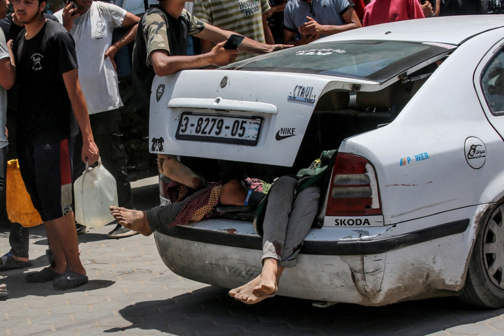 A car carrying injured people arrives at the al-Aqsa Martyrs Hospital in Deir al-Balah, in the central Gaza Strip, following the Israeli bombardment of a residential apartment in Deir al-Balah and an area of al-Maghazi, on June 8, 2024. Photo by Bashar TALEB / AFP.