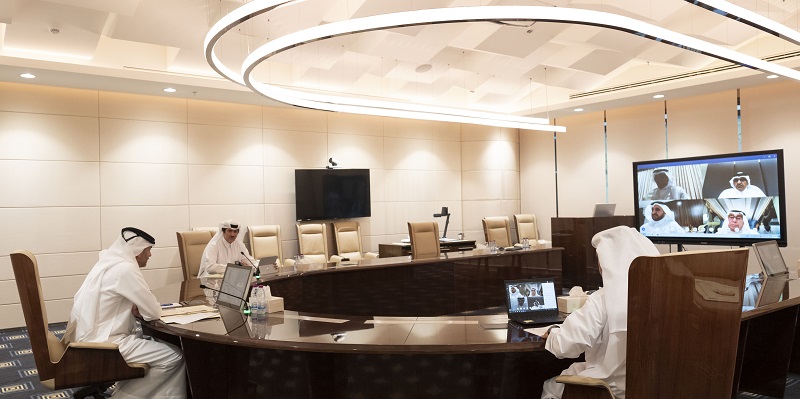 Prime Minister and Minister of Interior H E Sheikh Khalid bin Khalifa bin Abdulaziz Al Thani holding talks with chairmen and representatives of Qatar Chamber and Qatar Businessmen Association via video conferencing.