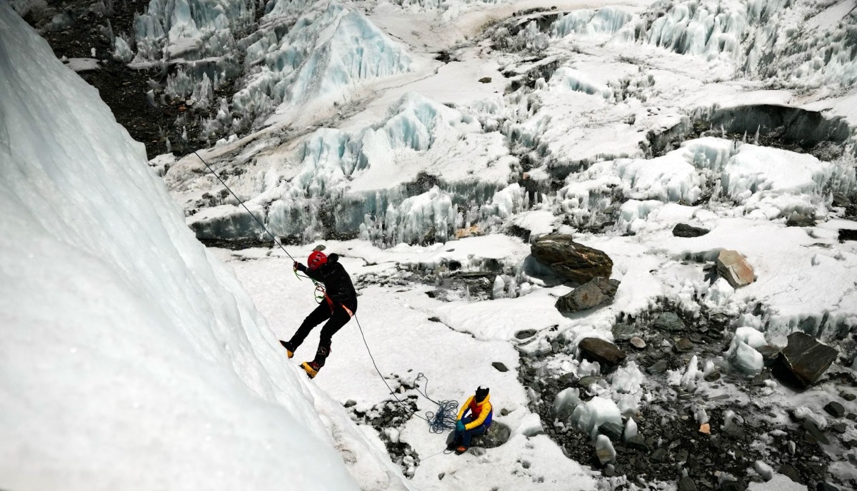 Safrina Latheef during an ice climbing training in Nepal's largest glacier, Khumbu Glacier, with her guide Anup Gurung