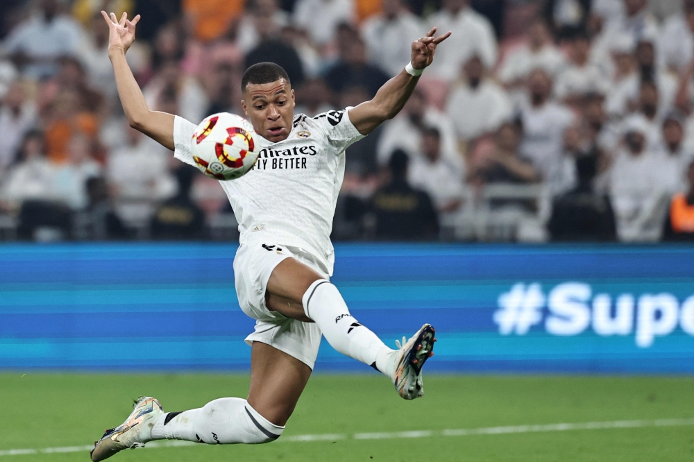 Real Madrid's French forward Kylian Mbappe reaches for the ball during the Spanish Super Cup semi-final football match between Real Madrid and Mallorca at the King Abdullah Sport City in Jeddah on January 9, 2025. (Photo by Fadel Senna / AFP)