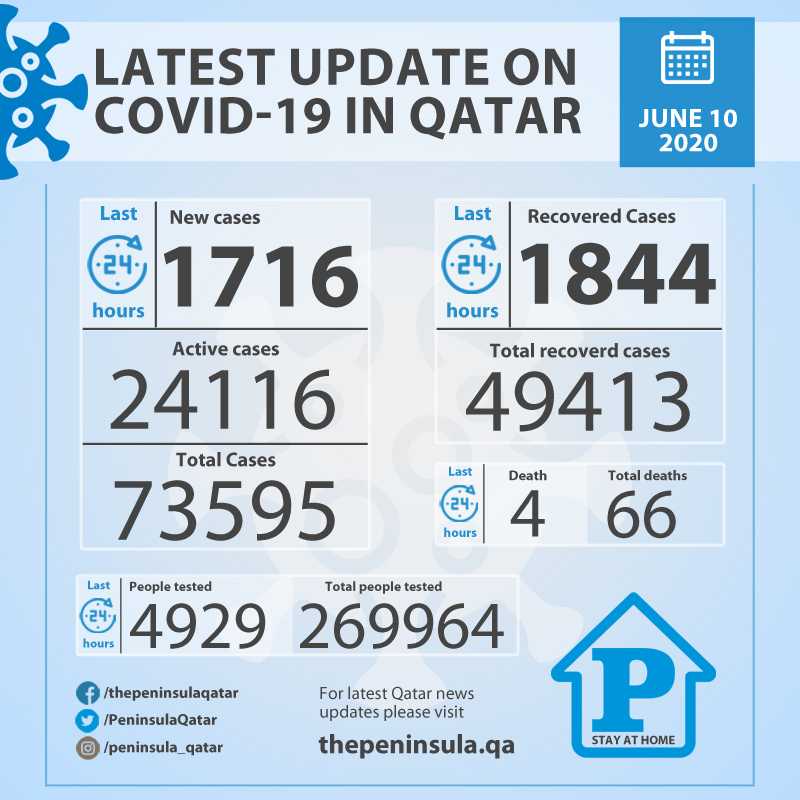 Ministry of Public Health today announced that 1,716 new confirmed cases of coronavirus (COVID-19) have been registered, and 1,844 people have recovered from the disease in the last 24 hours, bringing the total number of recoveries in Qatar to 49,413. The Ministry also announces 4 deaths due to the virus.