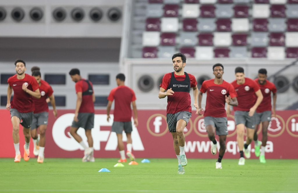 Qatar players take part in a training session to prepare for their last Group A match against India at the Asian Cup 2027 and FIFA World Cup 2026 joint qualifiers at Khalifa International Stadium yesterday. The game will be played at Jassim Bin Hamad Stadium tomorrow.