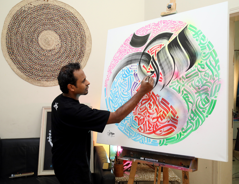 As a calligraphy artist, Kareem reacts through his work, and he believes that an artist becomes complete only if he or she shares his reaction against injustice and intolerance through art.