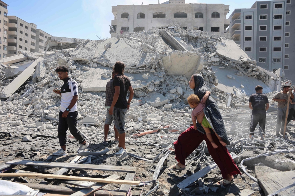 A Palestinian woman carries a child as she walks through the rubble near the Tiba tower which crashed to the ground moments after Israeli strikes targeted the high-rise building in Gaza City on September 10, 2025. (Photo by Omar Al-Qattaa / AFP)