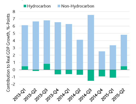 Based on its Brent crude oil price projections of an average $55 per barrel in 2015 and $53 in 2016, and assumptions regarding spending growth, Moody’s forecasts that the government’s fiscal surplus will decline to 6.4 percent of GDP in 2015, from 16.7 percent in 2014 and will turn into a small deficit of 2.4 percent of GDP in 2016.