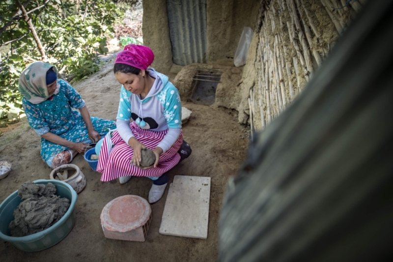 Moroccan potter Houda Oumal (R) and her mother Fatima Harama from the M'tioua tribe work on pottery near the village of Ourtzagh in the region of Taounate on June 11, 2019. AFP / FADEL SENNA