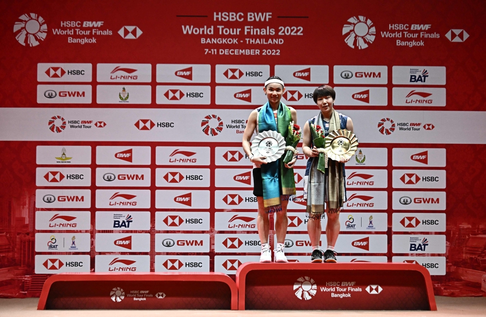 Japan's Akane Yamaguchi (right) holds the winner's trophy after her victory against Taiwan's Tai Tzu-ying during the women's singles final at the HSBC BWF World Tour Finals badminton tournament in Bangkok on December 11, 2022. (Photo by Lillian SUWANRUMPHA / AFP)