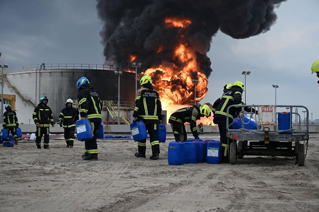 Doha, Qatar: Sharing photos from fire that broke out in the fuel tanks of one of the facilities in Muharraq Governorate, Bahrain's Ministry of Interior said that the Civil Defence teams are continuing their efforts to control the fire.