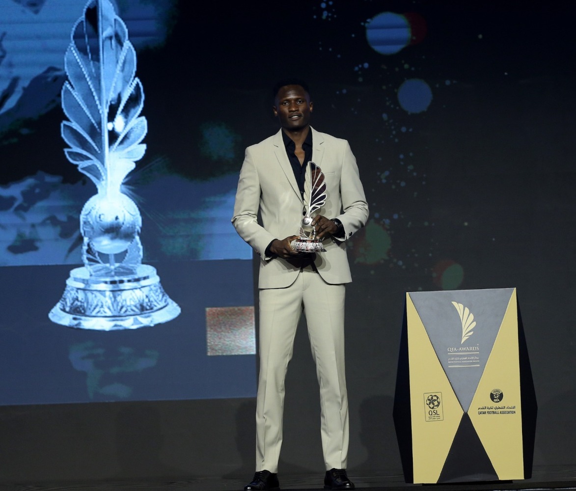 Al Duhail striker Michael Olunga holding the Mansour Muftah Award