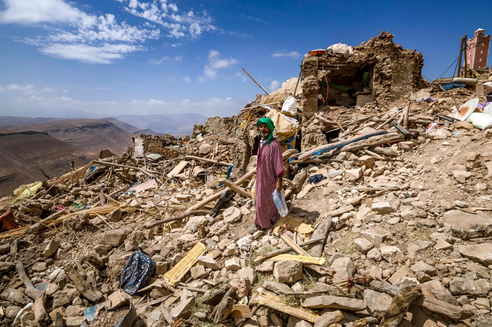 A villager walks through the rubble of destroyed houses in Douzrou on September 12, 2023, following a 6.8-magnitude earthquake. (Photo by Fadel Senna / AFP)