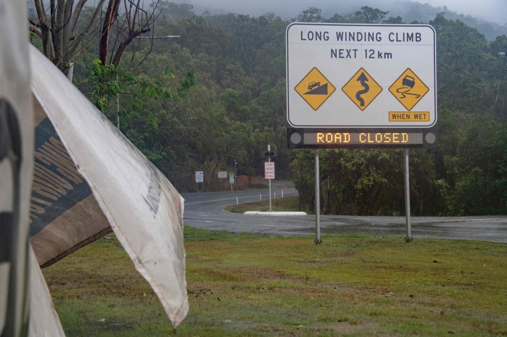 Signage showing a road closure is seen as Cyclone Jasper approaches landfall near Cairns in far north Queensland on December 13, 2023. Photo by Brian CASSEY / AFP