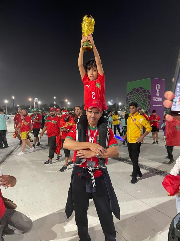Mohammed Aderdor, one of the Moroccan community leaders in Qatar, with his son during one of the Moroccan games at the FIFA World Cup Qatar 2022.