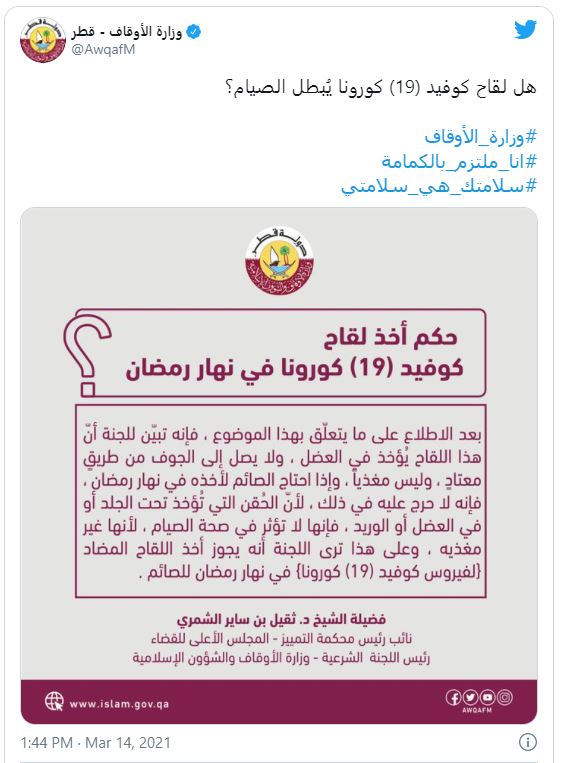 In a post on Twitter Sheikh Dr Thaqil bin Sayer Al Shammari, Deputy Head of the Court of Cassation in the Supreme Judiciary Council and Head of Shariah Committee the Ministry of Awqaf and Islamic Affairs, said that the vaccine does not break fast because it is taken intramuscularly and not taken orally and it is not nutritious.