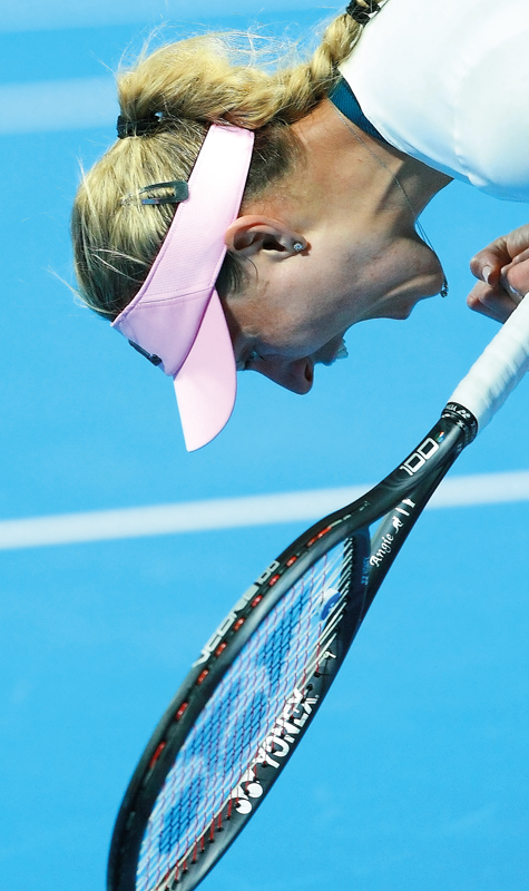 Germany’s Angelique Kerber reacts after defeating Czech Republic’s Barbora Strycova yesterday. Pictures: Vadakkemuriyil Rajan