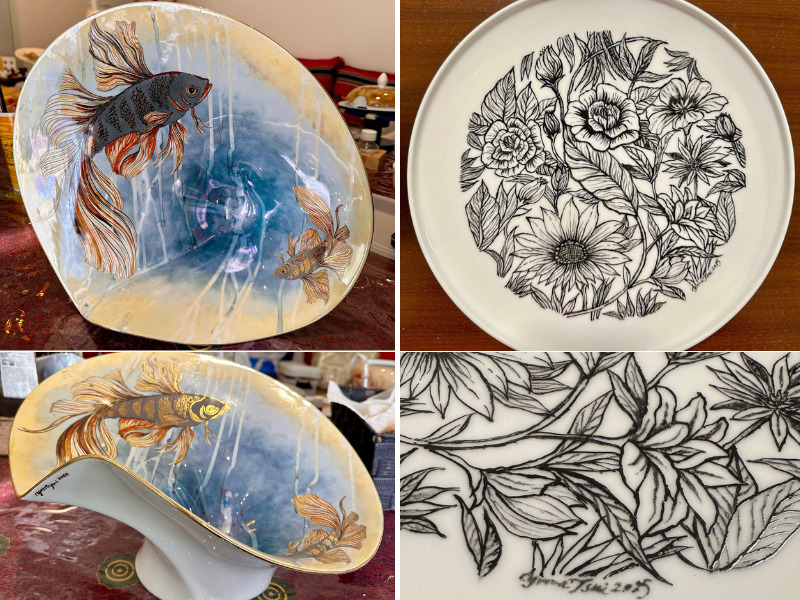 The multidisciplinary artist's hand-painted porcelain and ceramic pieces are carrying their own meaning. A floral design on porcelain plate is a nod to self-love and independence: "I can buy myself flowers!” she playfully declared. Meanwhile, her fish-themed pieces reflect a longing for freedom and peace.