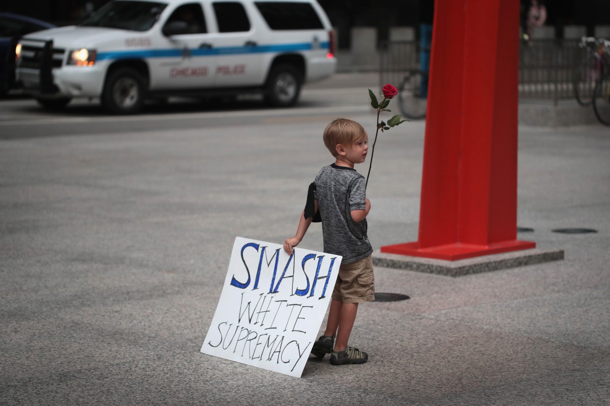 Four-year-old Leo Griffin leaves a protest against the alt-right movement held to mourn the victims of yesterdays rally in Charlottesville, Virginia on August 13, 2017 in Chicago, Illinois. Scott Olson/Getty Images/AFP