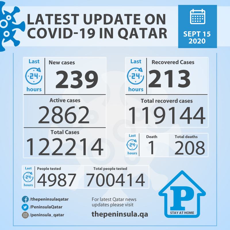 Doha: Ministry of Public Health (MoPH) today recorded 239 new cases of coronavirus (COVID-19) and 213 people recovered from the virus in the last 24 hours, bringing the total number of people recovered in Qatar to 119,144.