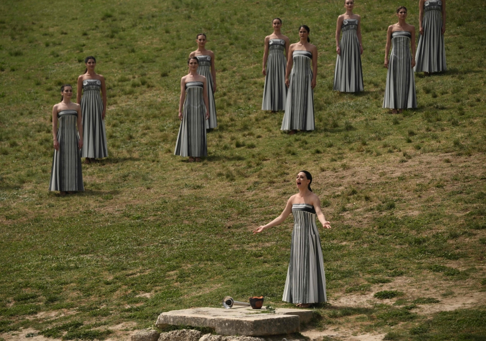 Greek actress Mary Mina (C), playing the role of the High Priestess, sings during the Olympic torch lighting ceremony for the Paris 2024 Olympics Games on April 16, 2024. (Photo by Angelos Tzortzinis / AFP)