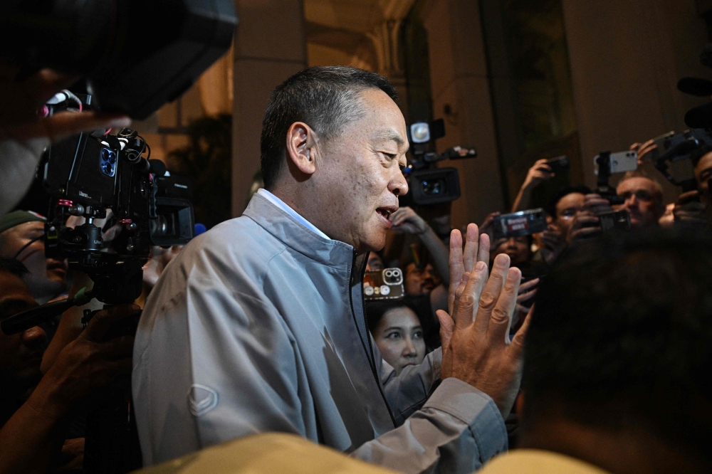 Thailand's Prime Minister Srettha Thavisin (C) talks to the media after an incident, in which six bodies were found at a hotel in Bangkok on July 16, 2024. (Photo by Lillian SUWANRUMPHA / AFP)