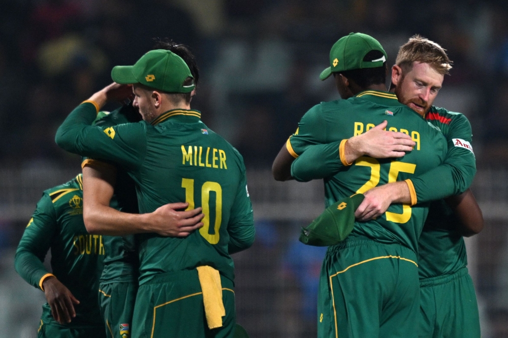 South Africa's players react after losing the 2023 ICC Men's Cricket World Cup one-day international (ODI) second semi-final match against Australia at the Eden Gardens in Kolkata on November 16, 2023. (Photo by Arun Sankar / AFP)