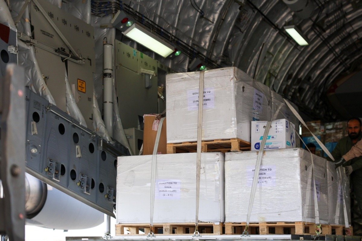 The assistance includes medicines provided by the State of Qatar and the French Republic, along with food items to be further transferred to Gaza, bringing the total number of the aircraft to 63 with the total quantity of 1,958 tons of aid.