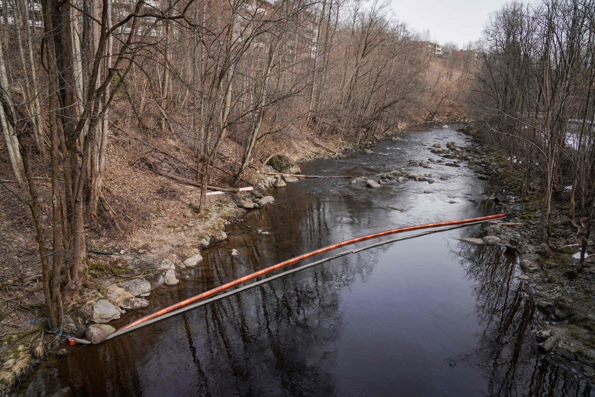 Booms to contain oil have been deployed in the Sandvikselva river in Baerum near Oslo, Norway on March 17, 2025 after several tons of oil leaked out following a break-in and damage to the Hamang substation this weekend. Photo by Ole Berg-Rusten / NTB / AFP