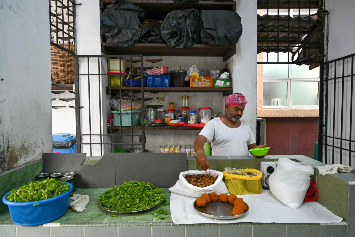 This picture taken on March 5, 2025 shows am Indian Muslim man preparing ingredients to make the popular dish 'Bubur Lambuk' at Masjid India during the Muslim holy fasting month of Ramadan in Kuala Lumpur. (Photo by Mohd RASFAN / AFP)