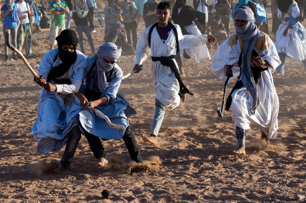 Locals play hockey during the 15th International Nomad Festival in Mhamid el-Ghizlane in Morocco's southern Sahara desert on March 24, 2018.