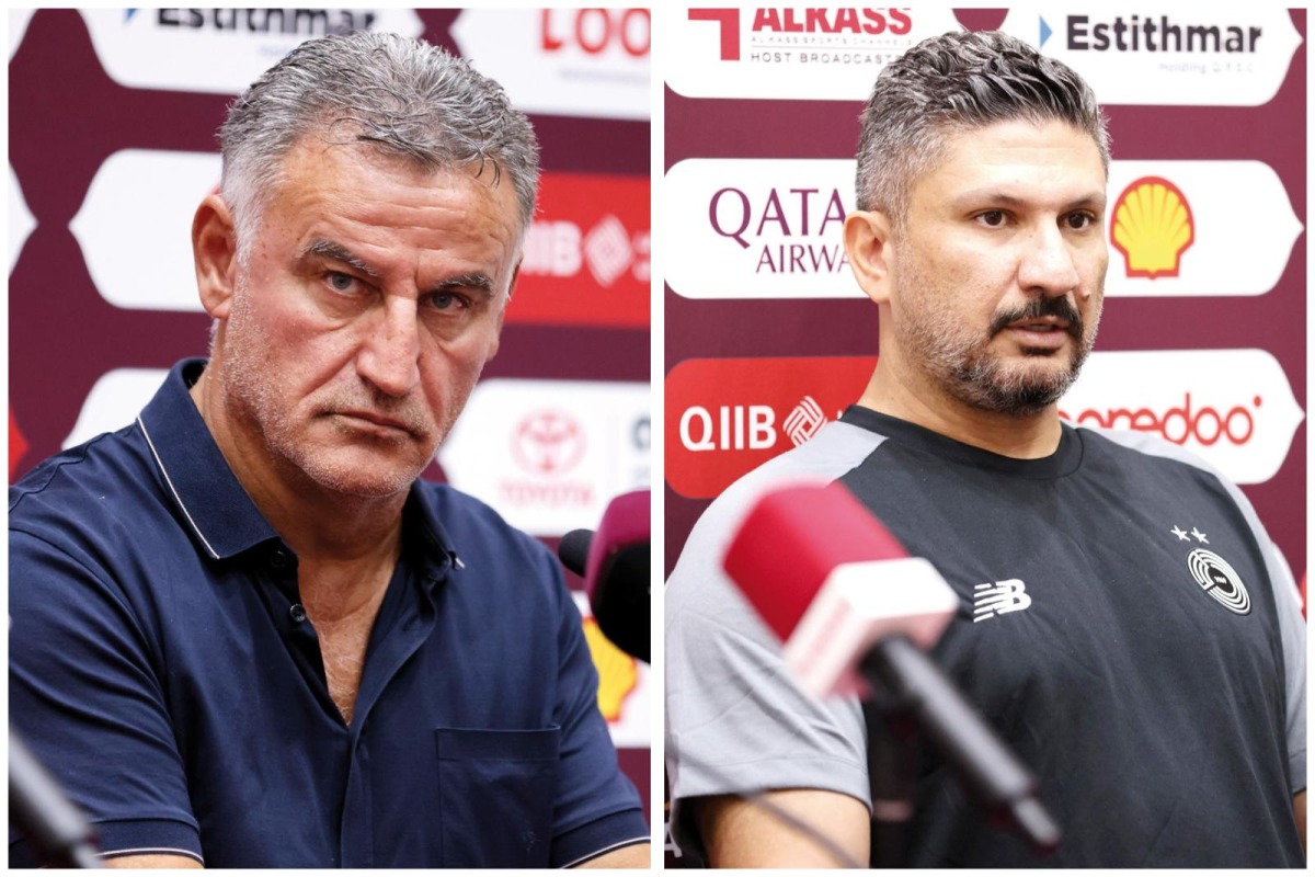 Al Duhail coach Christophe Galtier and Al Sadd coach Wesam Rizk