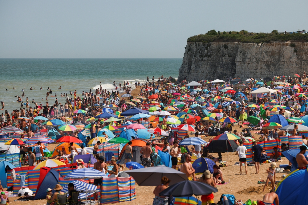 A general view shows beach-goers spending a hot summer day at the coast, at Joss Bay in Broadstairs, Britain, July 17, 2022. (REUTERS/Lisi Niesner)