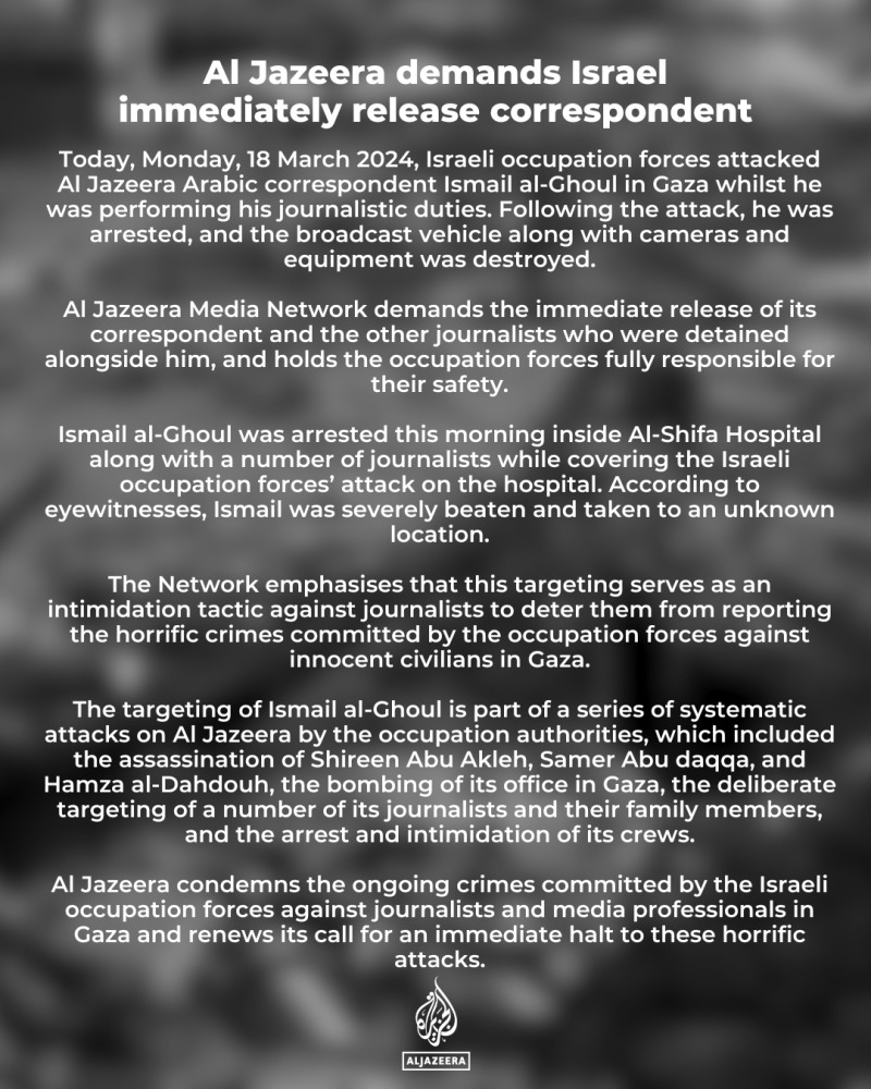 [6:38pm Doha Time] Al Jazeera demands Israel immediately release its correspondent, Ismail al-Ghoul.