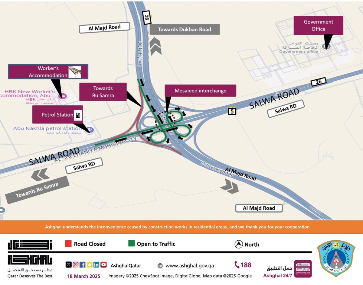 Additionally, a full traffic closure will be implemented on Al Majd Road heading towards Salwa Road (Mesaieed Interchange) for drivers coming from Dukhan Road.