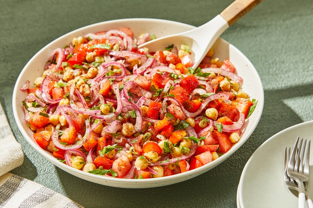 Substitutions: Red bell pepper >> yellow or orange bell pepper. Parsley >> mint. Canned chickpeas >> home-cooked chickpeas.