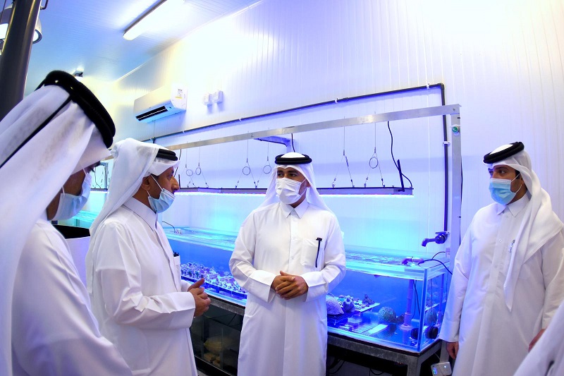 Additionally, the CMP includes the establishment of a unique land-based Coral Nursery at the Aquatic Fisheries Research Center (AFRC) in Ras Matbakh in northern Qatar. Over 400 live corals were taken to the Nursery for coral husbandry and the extracted corals were rehabilitated and fragmented. The fragmented corals were then out-planted to carefully selected recipient sites north of Sheraoh Island. To get a first-hand understanding of the nursery programme, officials from MME, Qatargas and QU recently paid a visit to the AFRC lab and interacted with the scientists and researchers.