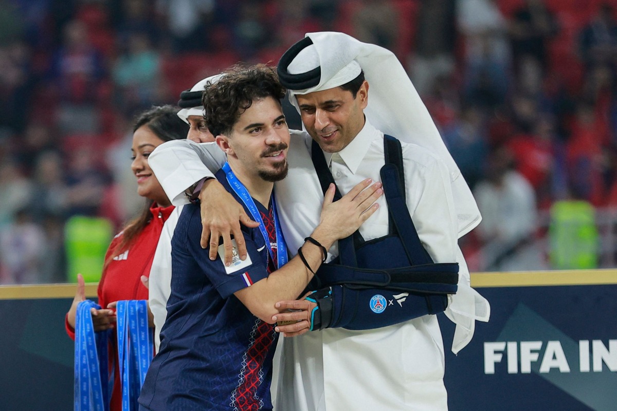 Paris Saint-Germain's Portuguese midfielder #17 Vitinha is congratulated by Paris Saint Germain's president Nasser al-Khelaifi after winning the 2025 FIFA Intercontinental Cup final football match between Paris Saint-Germain (PSG) and CR Flamengo at the Ahmad bin Ali Stadium in Al-Rayyan on the outskirts of Doha on December 17, 2025. (Photo by Karim JAAFAR / AFP)