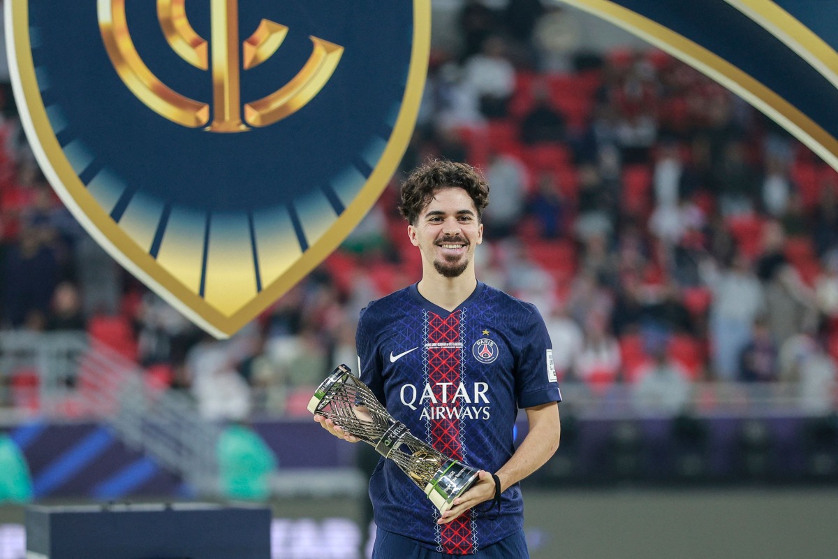 Paris Saint-Germain's Portuguese midfielder #17 Vitinha stands on the podium after receiving the Player of the Tournament trophy and after winning the 2025 FIFA Intercontinental Cup final football match between Paris Saint-Germain (PSG) and CR Flamengo at the Ahmad bin Ali Stadium in Al-Rayyan on the outskirts of Doha on December 17, 2025. (Photo by Karim JAAFAR / AFP)